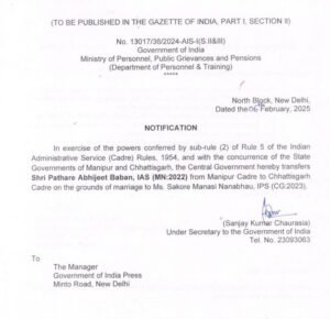 भारत सरकार के कार्मिक, लोक शिकायत और पेंशन मंत्रालय द्वारा 6 फरवरी को जारी अधिसूचना में यह जानकारी दी गई। नोटिफिकेशन के अनुसार, आईएएस अभिजीत बबन पठारे की आईपीएस साकोरे मानसी नानाभाऊ से शादी होने के कारण उनका ट्रांसफर किया गया है।
