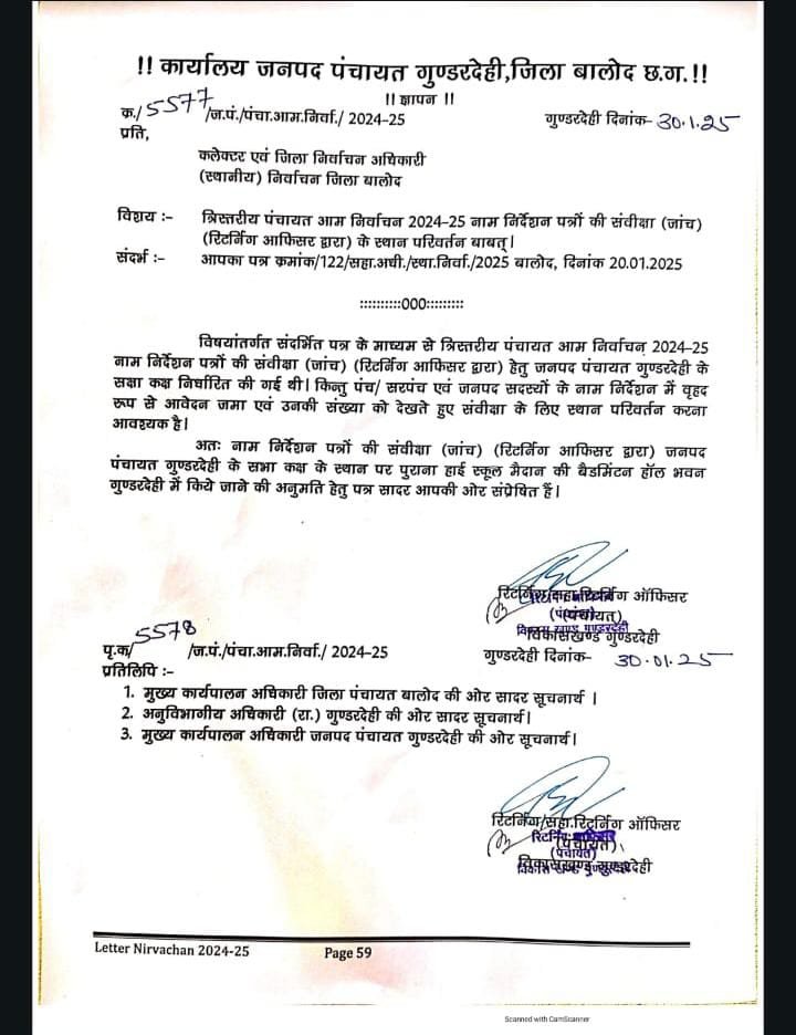 गुंडरदेही: यह एक सरकारी पत्र प्रतीत होता है, जो त्रिस्तरीय पंचायत आम निर्वाचन 2024-25 के नाम निर्देशन पत्रों की संवीक्षा...